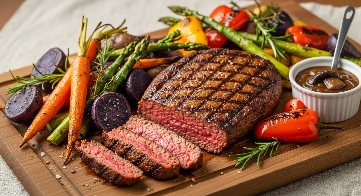 비건 스테이크는 단백질이 풍부한 버섯과 두부, 렌틸콩을 섞어 만든 ‘식물성 스테이크’예요. 오븐에서 구워 바삭하면서도 촉촉한 질감을 살리고, 발사믹 글레이즈를 곁들이면 고급 레스토랑 느낌이 나요. 겉은 카라멜라이즈되고 속은 부드러워서 육식주의자도 반할 맛이에요.