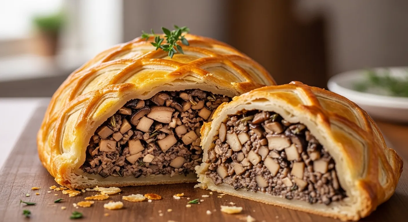 버섯 웰링턴은 크리스마스 디너의 상징 같은 요리예요. 포트벨로 버섯과 양파, 시금치를 볶아 파이시트로 감싸 구워내면 겉은 바삭, 속은 부드럽고 촉촉해요. 고기 대신 버섯을 활용하지만 풍미는 결코 뒤지지 않아요.