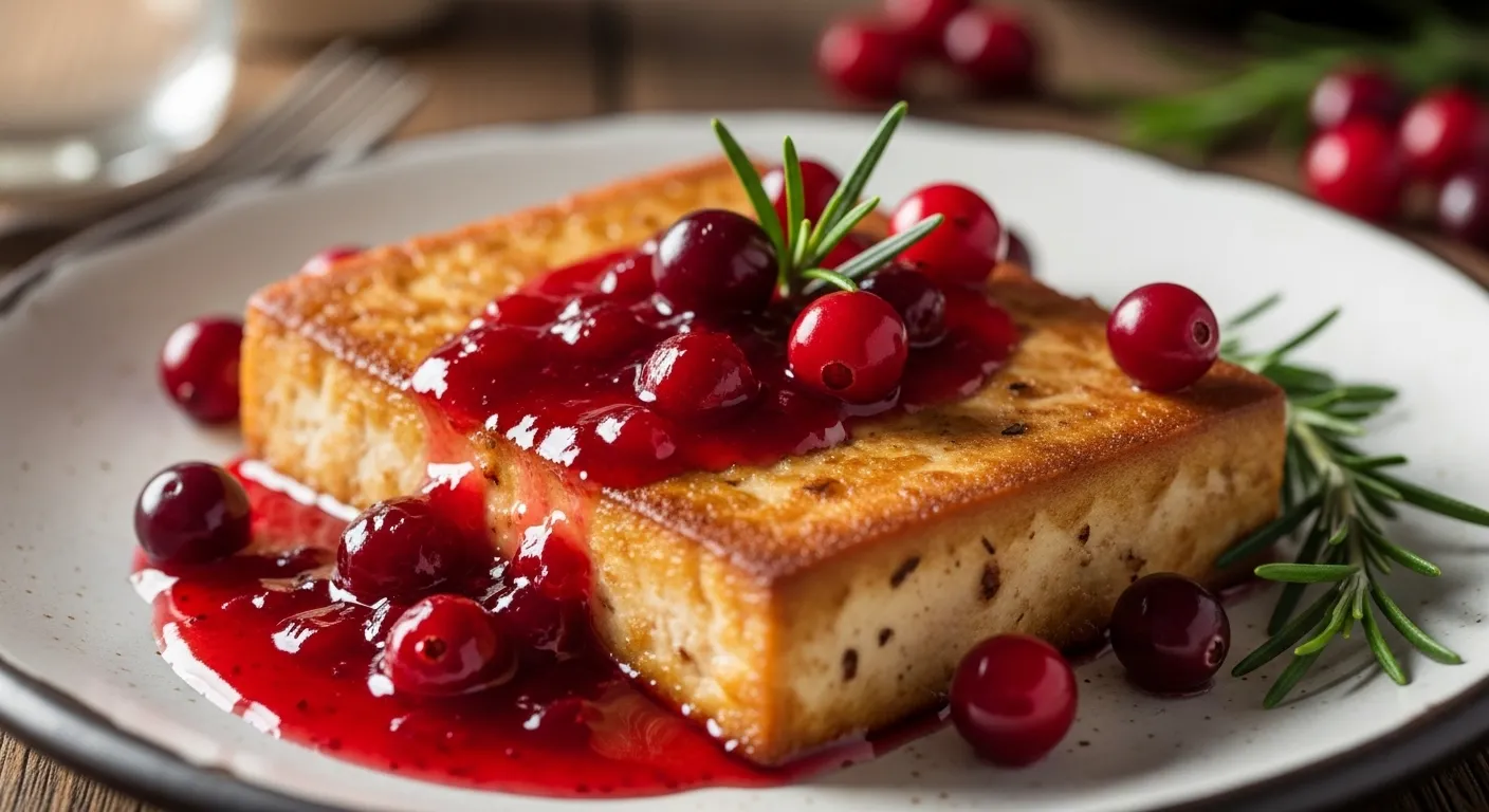 두부 스테이크에 크랜베리 소스를 얹은 요리예요. 단짠한 글레이즈가 두부의 담백함을 살리고, 붉은 크랜베리가 크리스마스 무드를 완성해줘요. 보기에도 화려하고 맛은 새콤달콤해요. 초간단 재료로도 훌륭한 비건 메인 디시가 된답니다. 🎄